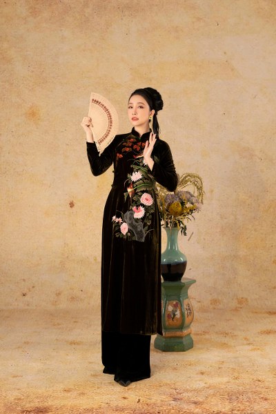 Linh Nga trong bộ áo dài nâu thêu bức tranh mùa thu của bộ 'Tứ bình'.