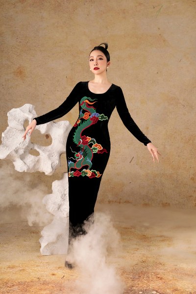 Linh Nga khoe sắc vóc trong bộ váy thêu rồng Tả thanh long. Rồng là con vật nằm trong bộ tứ linh, là loài cao quý và quyền uy nhất.