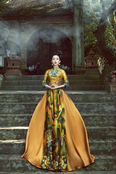 Nghệ sĩ múa Linh Nga thể hiện bộ sưu tập áo dài \"Kim sắc niên hoa\" được NTK La Sen Vũ lấy cảm hứng từ linh vật trâu vàng của năm Tân Sửu.