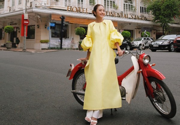 Diễn viên Rima Thanh Vy chọn áo dài cách tân tay bồng. Kiểu áo phù hợp với những người cao và gầy.