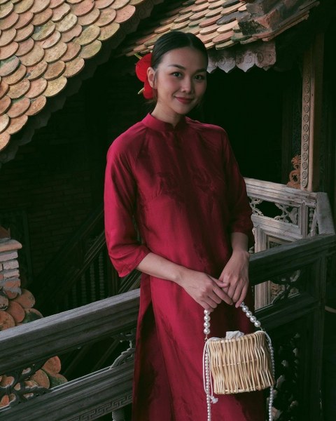 Thanh Hằng chọn áo dài cổ điển, cài hoa hồng môn trên tóc, phối túi cói.