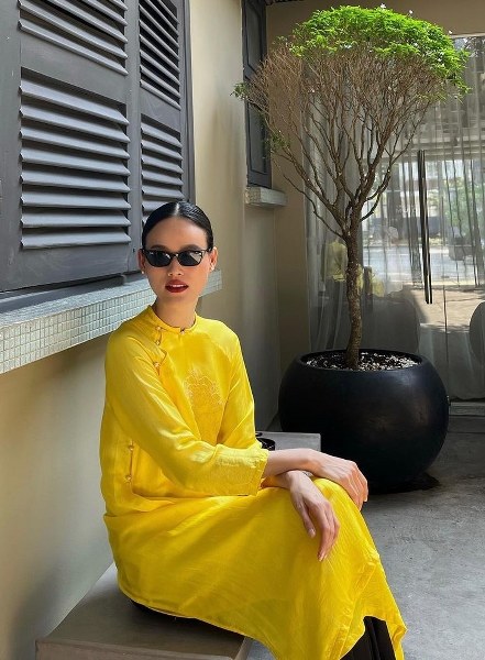 Phong cách truyền thống cũng được Tuyết Lan yêu thích. Người mẫu phối tà áo vàng với kính mắt mèo, quần lụa đen và giày cao gót của Prada.