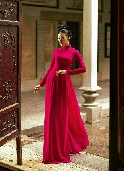 Hoa hậu Khánh Vân được tôn dáng với áo dài truyền thống màu hồng đỏ, búi tóc cao.