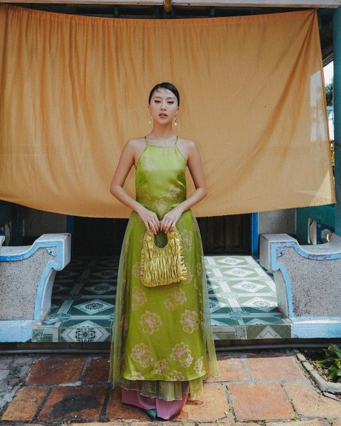Hương Ly được khán giả khen với cách phối áo dài cổ yếm cùng túi đan móc kiểu tay nải.