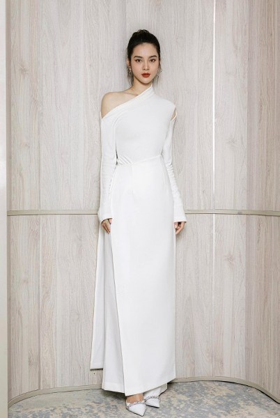 Diễn viên Quỳnh Lương chuộng áo dài bất đối xứng theo xu hướng tối giản, phối giày cao gót cùng tông.