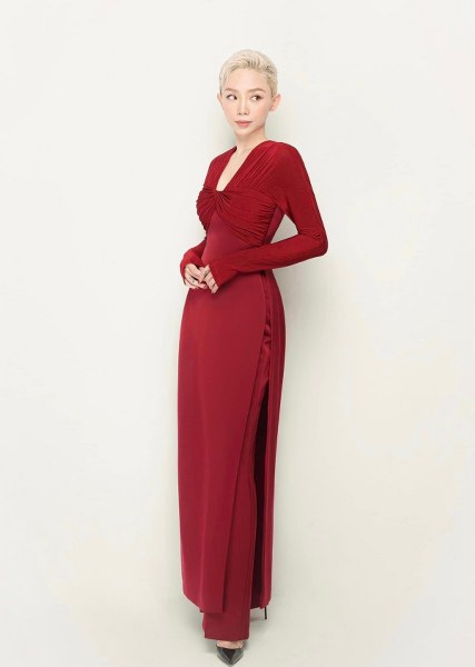 Tóc Tiên chọn màu áo dài màu đỏ với phần cổ khoét sâu theo phong cách sexy cô xây dựng nhiều năm qua.
