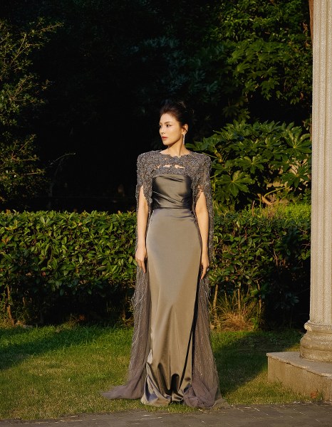Mẫu blazer cách điệu được cô phối với đầm kim tuyến và ví cầm tay kiểu dáng tối giản.