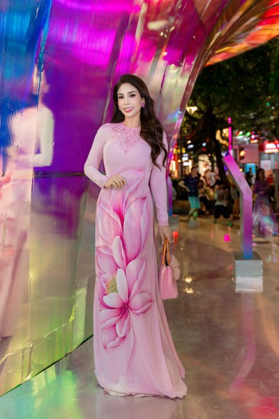 Lý Hương diện áo dài được đính kết bắt mắt, khoe nhan sắc trẻ trung. Điểm nhấn của bộ trang phục là chi tiết cách điệu ở phần tay áo, mang đến sự mới mẻ cho người mặc. Tại sự kiện, cô có dịp hội ngộ nhiều sao Việt như Hà Kiều Anh, Băng Châu…