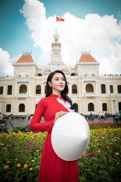 Hoa hậu Du lịch Việt Nam toàn cầu 2022 nối tiếp chuỗi ảnh mừng Đại lễ năm nay bằng bộ hình với chiếc áo dài đỏ rực, thêu chim bồ câu trắng trước ngực.