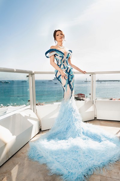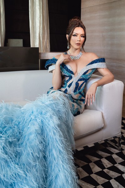 Người đẹp chọn đầm của Lê Thanh Hòa, nhấn vào phần đuôi váy dài đính lông đà điểu.