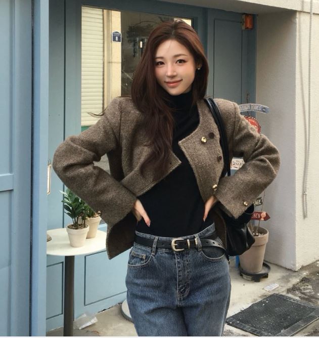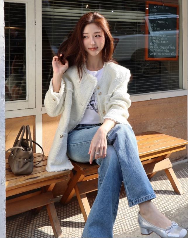 Áo khoác dạ tweed thường có dáng gọn, chiều dài vừa phải, dễ phối cùng váy liền, chân váy hoặc quần vải. Các chi tiết như viền tua rua, cúc kim loại hay phối màu nhẹ nhàng giúp chiếc áo thêm phần cuốn hút mà không bị quá rườm rà. Khi diện áo tweed trong dịp Tết, chỉ cần kết hợp cùng túi xách nhỏ và giày đơn giản là đã đủ tạo nên vẻ ngoài thanh lịch, phù hợp với không khí đầu xuân.