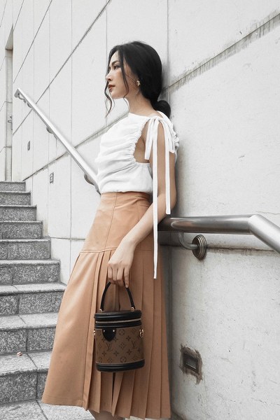 Set đồ dành riêng cho các nàng mê chân váy midi. Kiểu đầm xếp ly được biến tấu ấn tượng có thể mix cùng nhiều mẫu áo phom dáng đa dạng.