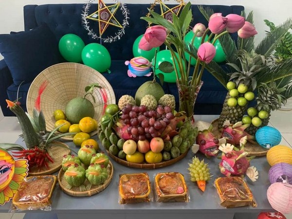 Mâm cỗ ngày này có rất nhiều món hoa quả, bánh kẹo vì thế không nhất thiết phải đặt vào mâm như mâm cúng gia tiên, chỉ cần đặt lên một chiếc bàn rộng.