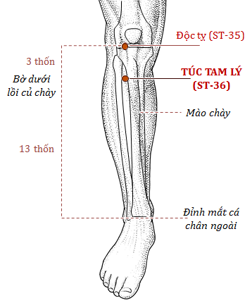 Cách làm: Dùng đầu ngón tay cái nhẹ nhàng ấn và xoa vào huyệt túc tam lý khoảng 2 phút, cho đến lúc cảm thấy hơi nhức nhức là được.