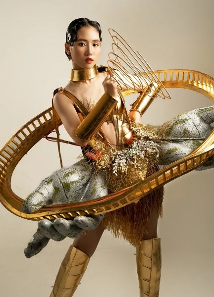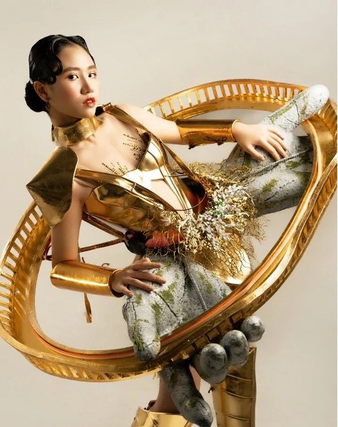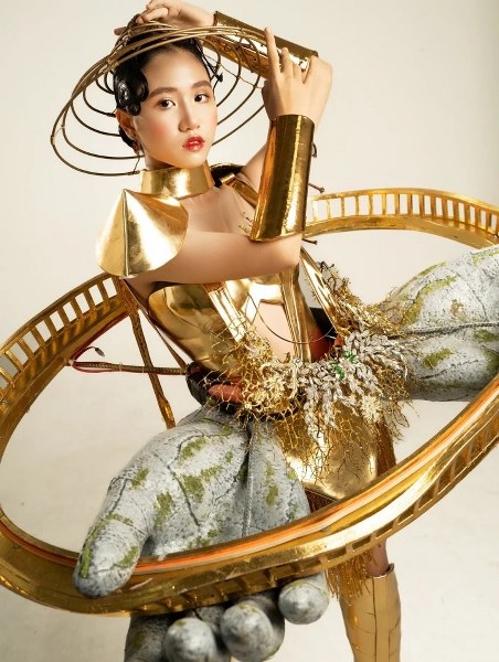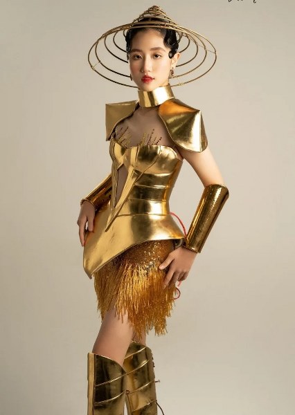 Mới đây, mẫu nhí này tung ra loạt ảnh mới có tên "Vũ khúc ánh sáng". Đây là trang phục đặc biệt được lấy cảm hứng từ cầu Vàng ở Đà Nẵng. Bộ trang phục gây ấn tượng với đặc trưng hai bàn tay được thể hiện một cách đầy tỉ mỉ và tinh xảo, cộng với tông màu vàng sang trọng.