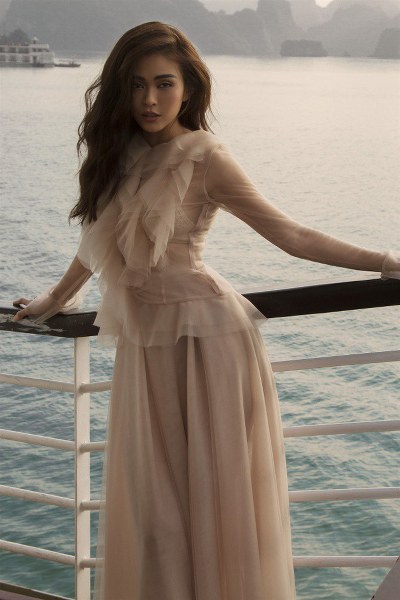 Đến bộ này, người đẹp lại gây thương nhớ với hình tượng nữ tính trong thiết kế đầm voan mỏng, có phần bèo nhún ở trước ngực. Lúc này, trông cô nhẹ nhàng, thanh tao giữa biển trời mây nước