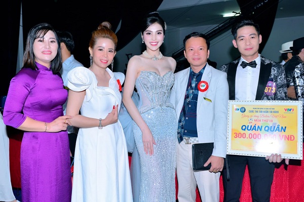 MC Kim Huyền Sâm (ở giữa) cùng Nhà báo Phạm Ngọc Đoá, Quán quân mùa thứ 10 Nguyễn Ngọc Khánh và ekip