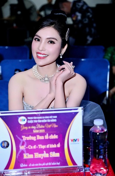 MC Kim Huyền Sâm được khen ngợi về nhan sắc khi xuất hiện tại đêm chung kết xếp hạng và trao giải cuộc thi Giọng Ca Vàng Bolero Việt Nam.