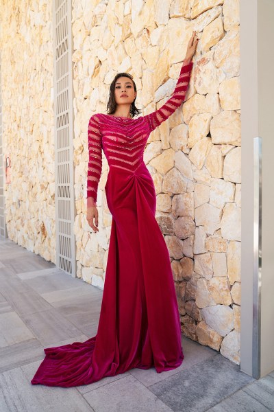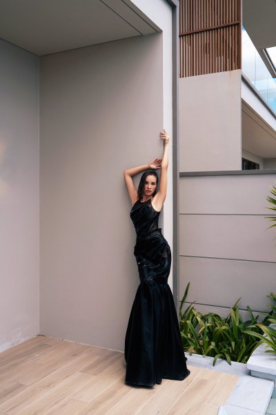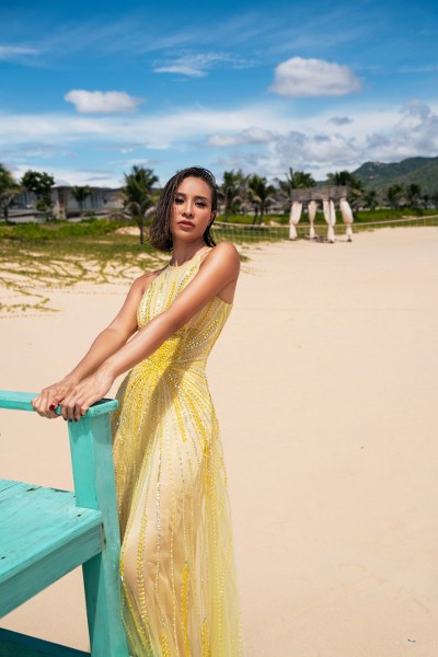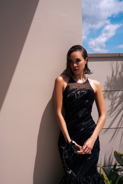 Nhà thiết kế chia sẻ, bên cạnh các chất liệu quen thuộc tạo phom đầm đuôi cá như lưới, nhung, anh kết hợp với voan, lông vũ, ren để mỗi bộ cánh thêm phần mềm mại. Từng họa tiết thêu, đính kết tạo hiệu ứng bắt sáng khiến mỗi bước chân, chuyển động của Phương Mai trở nên nổi bật.