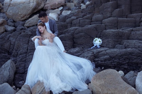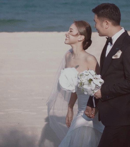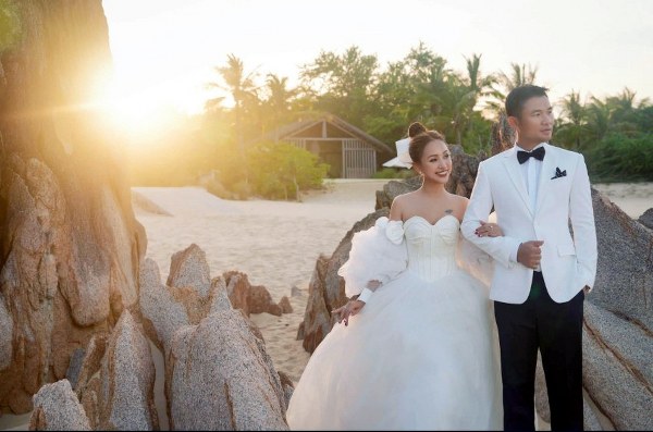 Trong bộ ảnh chụp ở biển, MC Vân Hugo diện váy cưới, hạnh phúc bên chồng doanh nhân Đặng Cường.
