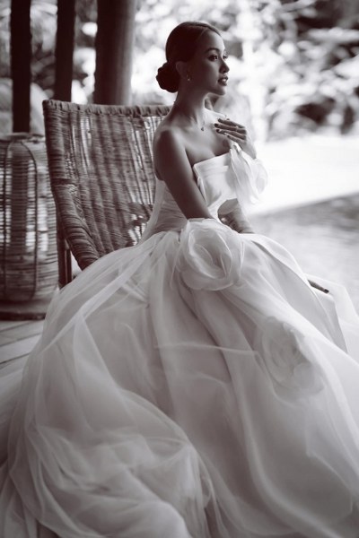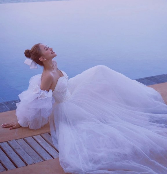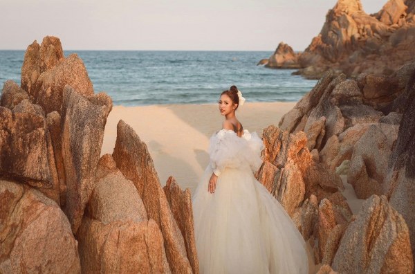 Trong bộ ảnh chụp trên biển, MC Vân Hugo diện váy cưới bồng bềnh.