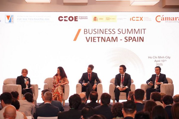 Các diễn giả tham gia Diễn đàn Doanh nghiệp Việt Nam - Tây Ban Nha: Bà Inmaculada Riera, Giám đốc Phòng Thương mại và Công nghiệp Tây Ban Nha; bà Emma Antolín, Phó Chủ tịch tập đoàn Antolin; ông Antonio Sedano, Giám đốc tài chính vùng APAC của Meliá Hotels International; ông Đặng Thanh Tùng, Giám đốc Đầu tư, Công ty Cổ phần Vinpearl; ông Triết Lưu, Đồng sáng lập và Trưởng nhóm R&D Impact Technical Resources (ITR)