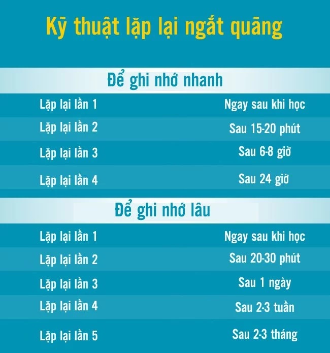 3. Nhắc lại nhiều lần: Trí nhớ được lặp đi lặp lại nhiều lần được gọi là trí nhớ "cơ bắp". Rèn luyện trí nhớ cơ bắp thường xuyên sẽ giúp bạn có một trí nhớ tốt và hình thành phản xạ tự nhiên với vấn đề đã ghi nhớ. Trí nhớ "cơ bắp" là bí quyết tốt nhất để học ngoại ngữ.