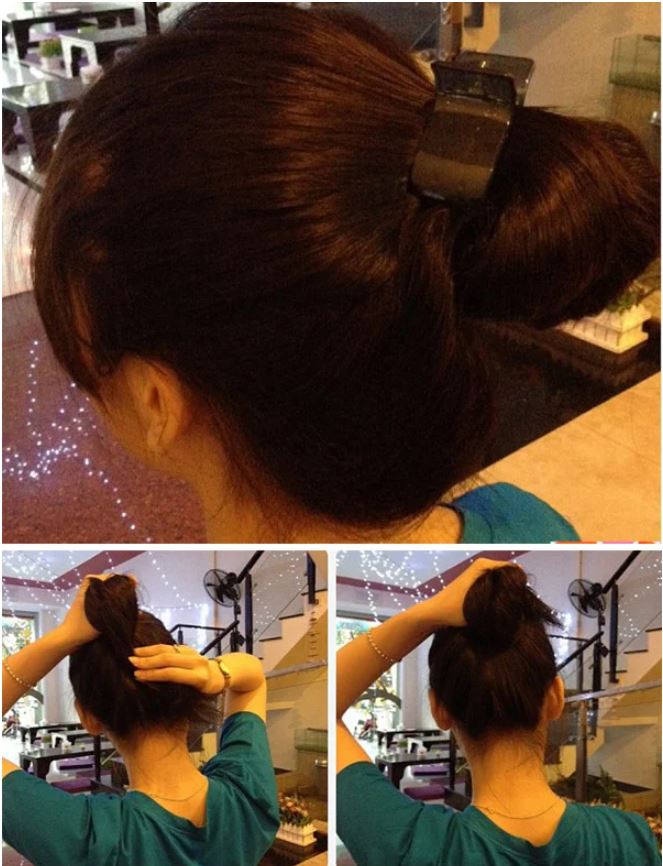 – Bạn dùng kẹp càng cua cố định để tóc búi không bị xô lệch.