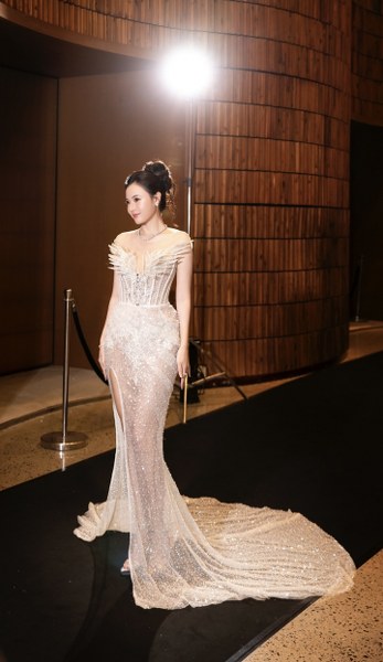 Thiết kế tạo hiệu ứng phát sáng lấp lánh dưới ánh đèn flash, đồng thời kết hợp chi tiết cánh bướm tinh tế ngay phần ngực và đường xẻ tà cao đầy quyến rũ.