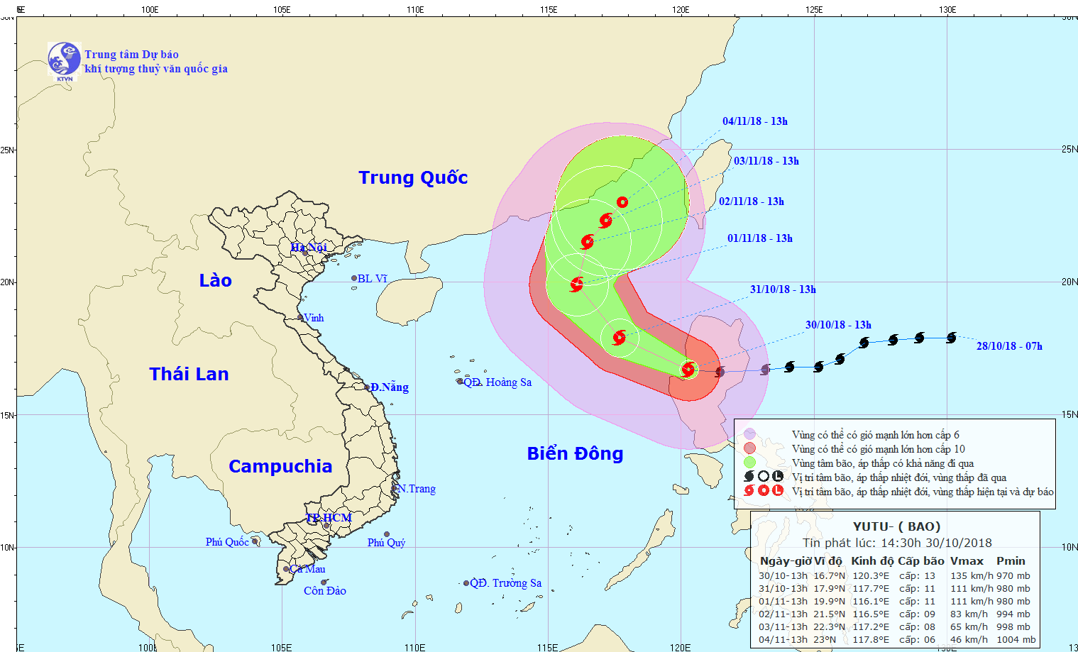 Trong 48 đến 72 giờ tiếp theo, bão di chuyển theo hướng Tây, mỗi giờ đi được 10-15km và có khả năng mạnh thêm. Đến 19h ngày 24/11, vị trí tâm bão ở khoảng 11,7 độ Vĩ Bắc; 109,5 độ Kinh Đông, trên vùng biển các tỉnh Nam Trung Bộ. Sức gió mạnh nhất vùng gần tâm bão mạnh cấp 9-10 (75-100km/giờ), giật cấp 12.