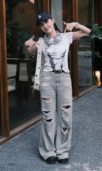 Đời thường hay khi đi du lịch, dạo phố, cô chuộng phong cách năng động, trẻ trung với áo phông, quần jeans rách cá tính; áo khoác denim phối cùng mũ lưỡi trai, túi xách và đồng hồ, tạo tổng thể đơn giản nhưng vẫn thời thượng, linh hoạt trong nhiều hoàn cảnh.