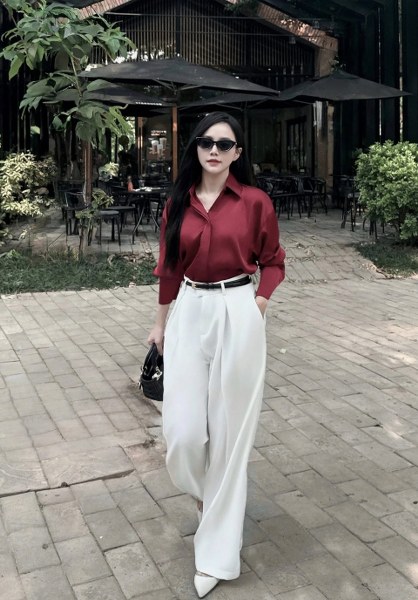 Minh Thu thanh lịch với áo sơ mi lụa tông đỏ nổi bật, phối cùng quần suông cạp cao màu trắng, tạo tổng thể chỉn chu mà vẫn trẻ trung, hiện đại.