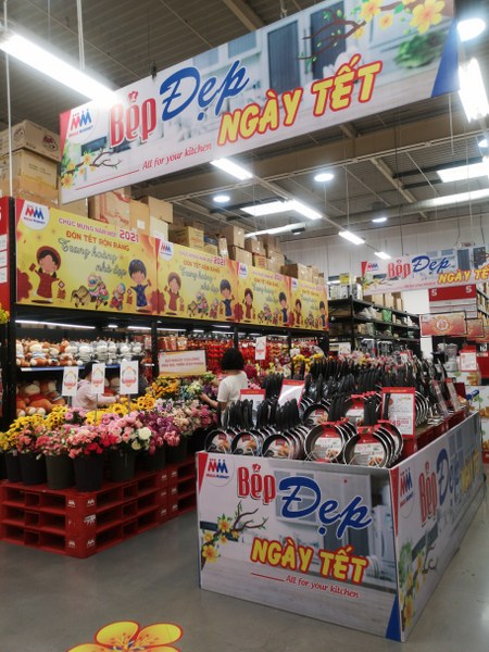 MM luôn đảm bảo dự trữ đầy đủ lượng hàng hoá có nhu cầu tăng cao vào dịp Tết với giá cạnh tranh, cam kết giá tốt so với thị trường, bao gồm: dầu ăn, các chất tẩy rửa, nước lau sàn, dung dịch rửa chén, đường, bia, các loại đồ uống giải khát, các sản phẩm trang trí nhà cửa, bánh kẹo mứt, hoa quả, và các thực phẩm đặc trưng trong các bữa ăn truyền thống ngày Tết như: thịt heo, thịt gà, bánh chưng, gạo nếp, các loại đậu, bột,…