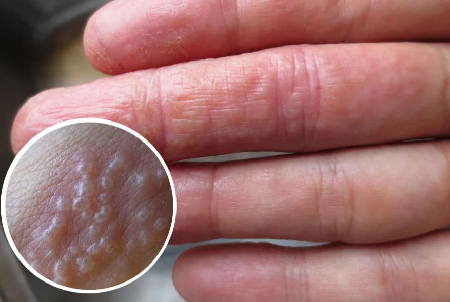 Không ít trường hợp mụn nước mùa hè thực chất là biểu hiện ban đầu của bệnh chàm tổ đỉa – một dạng viêm da mãn tính đặc trưng bởi các nốt mụn nước nhỏ li ti, mọc đối xứng ở lòng bàn tay hoặc bàn chân. Bệnh có xu hướng tái phát nhiều lần, đặc biệt khi thay đổi thời tiết hoặc tiếp xúc với hóa chất, chất tẩy rửa.