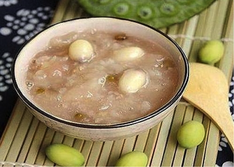 Cháo hạt sen, hạch đào nhân, hạt súng: hạt sen vị ngọt chát, tính bình, có tác dụng bổ tỳ ngừa tiêu chảy, dưỡng tâm an thần, chữa trị các bệnh chán ăn, mất ngủ, huyết trắng, rong huyết, trong hạt sen có chứa hàm lượng tinh bột và đường rất cao, ngoài ra còn có các chất béo, đạm, canxi; hạch đào nhân vị ngọt, tính ôn có tác dụng chữa rong huyết, di tinh, đái dắt, có tác dụng bổ gan, thận, dưỡng huyết kiện não, làm đen tóc; hạt súng vị ngọt, tính bình có thể chữa các chứng tỳ hư, tiêu chảy, thấp nhiệt khí hư. Hạt sen, hạt súng, hạch đào nhân mỗi thứ 18g, gạo tẻ ngon 50g, nước, gia vị vừa đủ. Cho ba thứ hạt trên rửa sạch, ngâm trong vòng 1 giờ rồi đun chín, tiếp tục cho gạo tẻ vào đun nhừ thành cháo. Món cháo này bổ thận tỳ, rất tốt cho phụ nữ tuổi mãn kinh nên có thể ăn thường xuyên được.