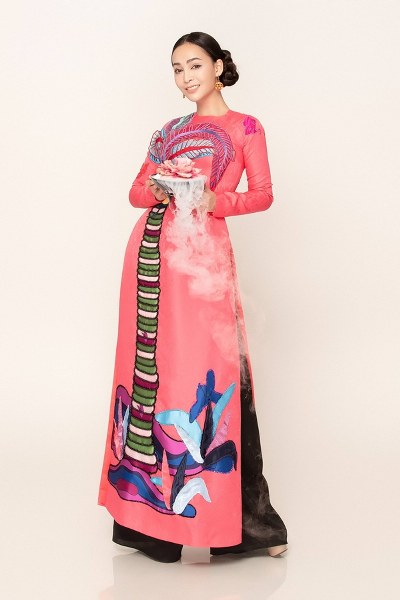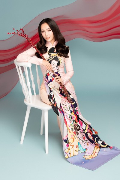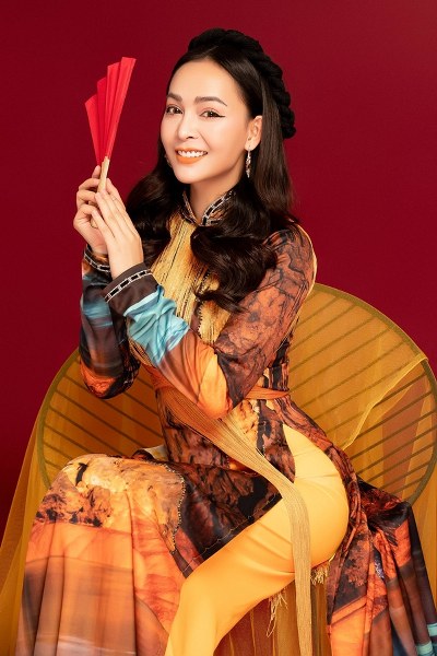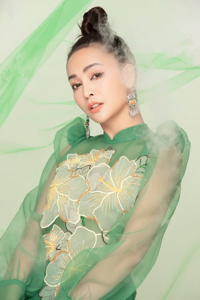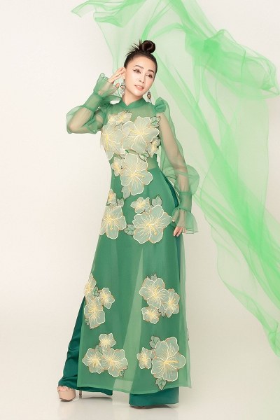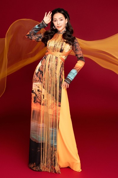 Nữ ca sĩ diện áo dài truyền thống được thêu họa tiết cầu kỳ, vừa tôn lên ngoại hình vừa phù hợp không khí Tết sắp đến.