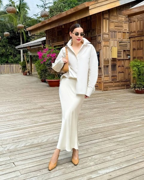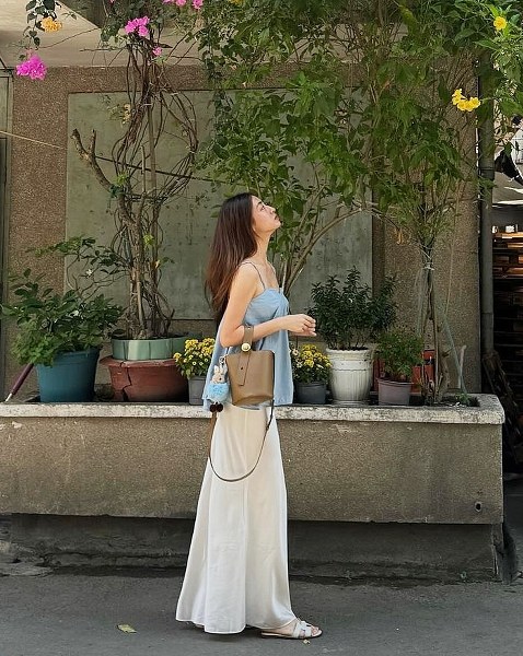 Lương Thùy Linh dạo phố với chân váy lụa trắng và áo babydoll.