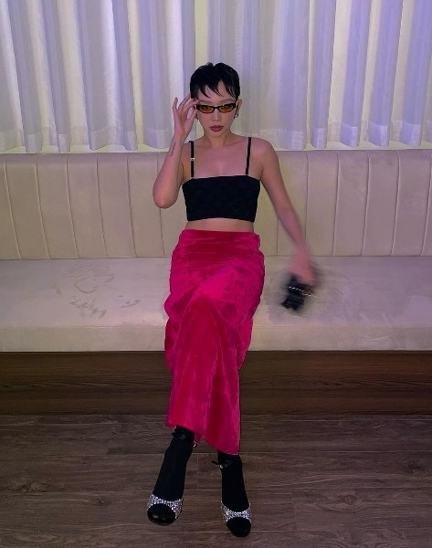 Ca sĩ Yến Trang tạo phong cách với váy xếp nếp và crop top.