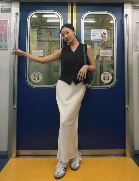 Phong cách dạo phố của Văn Mai Hương mang hơi hướng công sở với áo gilet, sneakers.