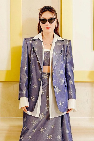 Mỹ Tâm xuất hiện trong phong cách ‘chị trợ lý’ với bộ suit cách điệu được siết eo có phần cổ V, phối cùng vòng hạt trai, thân dưới là quần baggy trẻ trung.