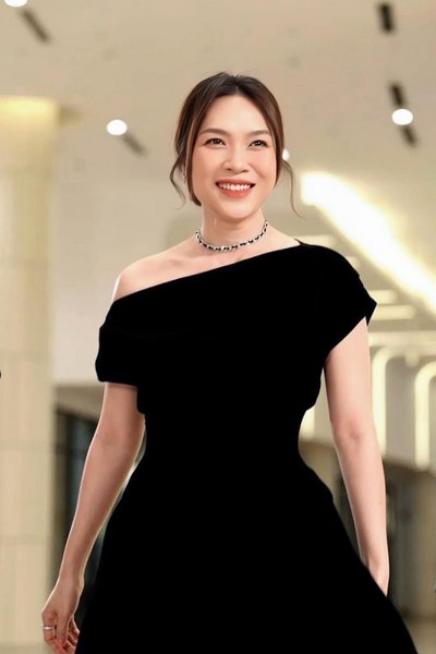 Nữ giám khảo quay trở lại phong cách nhẹ nhàng khi diện đầm đen lệch vai, cùng mái tóc được búi gọn.
