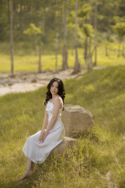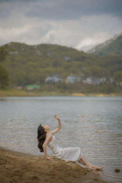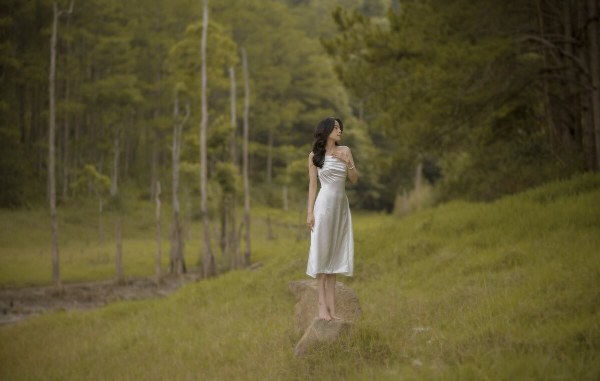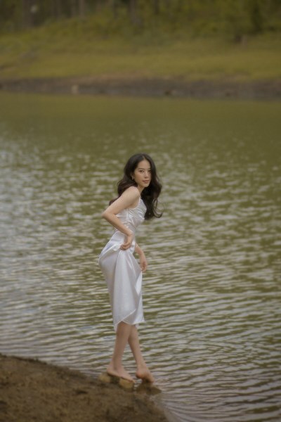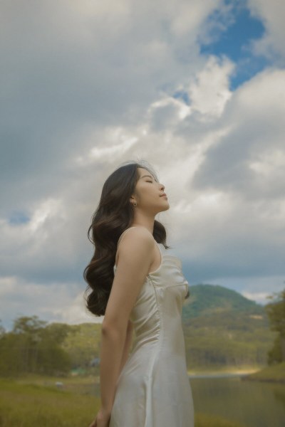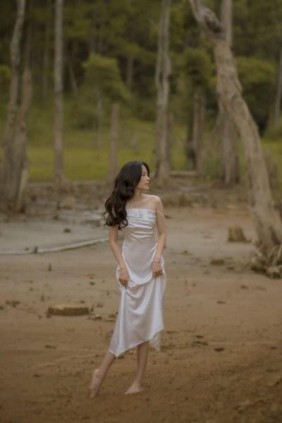 Hoa khôi Nam Em diện váy dây, khoe vẻ đẹp mong manh khi dạo bước, ngắm cảnh thiên nhiên hoang sơ, trong lành của vùng cao nguyên.