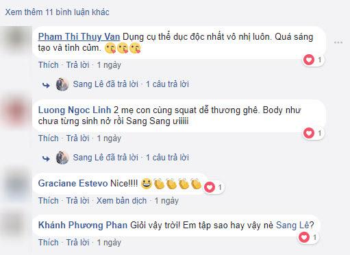 Khi được hỏi về phản ứng của đại gia mía đường Việt Anh khi thấy vợ lấy lại dáng nhanh mà con lại khỏe mạnh đáng yêu, Sang Lê hạnh phúc cho biết: "Mình thấy anh rất vui. Mình cảm nhận là như vậy. Thực tế, ông xã mình luôn muốn vợ khỏe trước rồi sau đó thì đẹp được bao nhiêu thì đẹp theo khả năng. Chứ không hối thúc hay khó chịu khi vợ mới sinh sồ sề này kia.