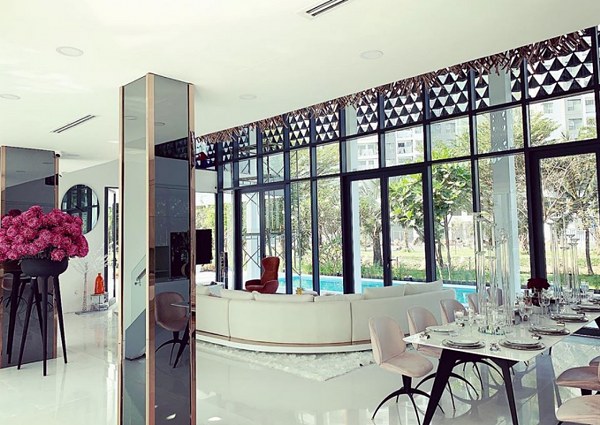 Phòng khách và bếp nhà Ngọc Trinh rộng khoảng 170 m2, được nối liền nhau. Từ góc này có thể nhìn thẳng ra hồ bơi bên ngoài. Đây là nơi người đẹp bơi lội rèn luyện sức khỏe hoặc nô đùa cùng hội bạn thân khi họ đến chơi.