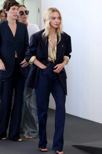 Diễn viên Amanda Seyfried được Elle xếp vào nhóm sao mặc đẹp tháng 10 với bộ cánh cơ bản, gồm sơ mi, blazer và quần jeans ống đứng.