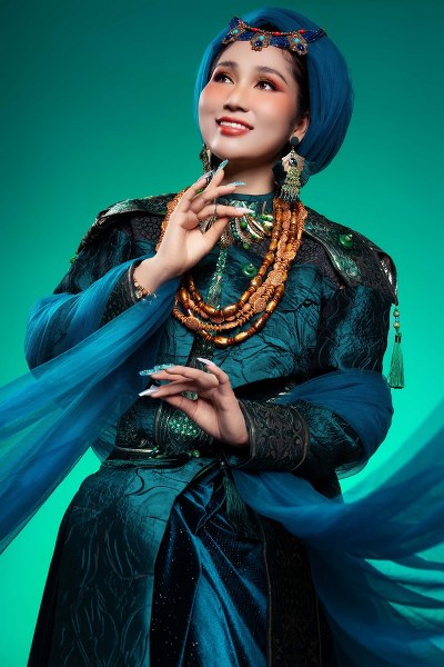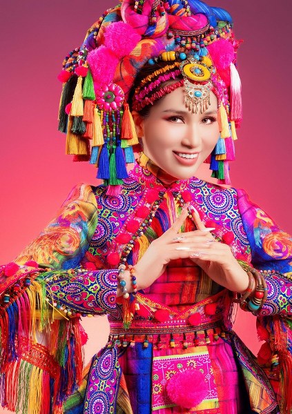Khuôn mặt thanh tú của cô được tôn trọn nhờ bộ trang phục rực rỡ và chiếc nón đội đầu.