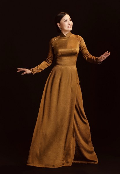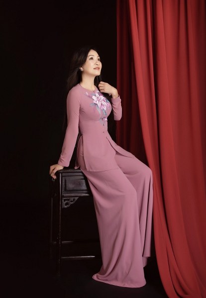 Nghệ sĩ Hồng Đào khoe vẻ đằm thắm khi làm mẫu áo dài cho nhà thiết kế Minh Châu.