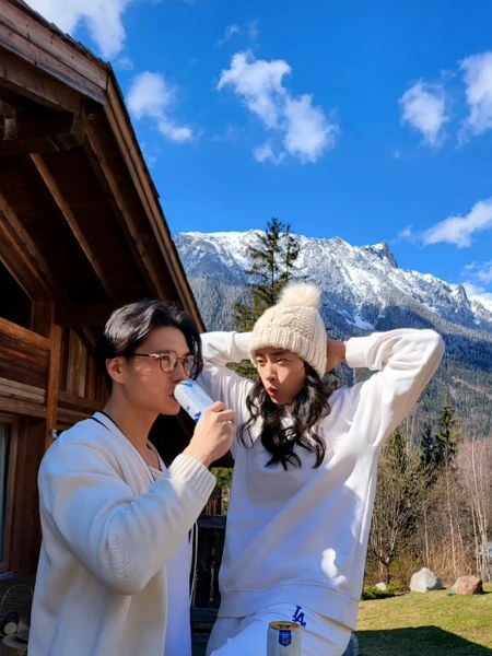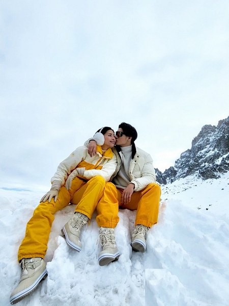 Ngô Thanh Vân và Huy Trần cùng trượt tuyết đang có chuyến công tác kết hợp du lịch ở dãy Alps.