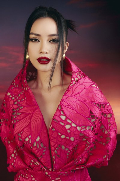 Ngọc Châu diện đầm ngắn tạo khối 3D họa tiết hoa thược dược của NTK Công Trí. Gam màu hồng tím tượng trưng cho nhiệt huyết và đam mê của tuổi trẻ được cô kết hợp cùng son môi màu đỏ quyến rũ.