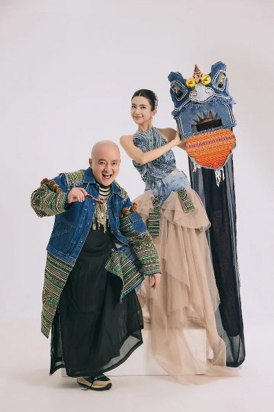 Ngọc Huyền - Nữ diễn viên phim "Gia tài của cha" tự tin tạo dáng bên cạnh những người mẫu nhí khi diện những bộ trang phục có chất liệu thổ cẩm kết hợp với denim.